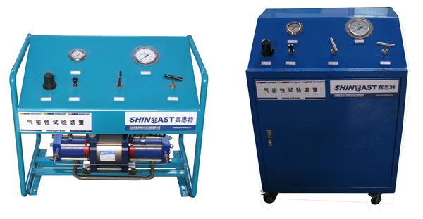 該裝置是采用我公司生產的增壓比為 40:1的氣體增壓泵,其動力來源是空壓機的0.3-0.8MPa的壓縮空氣,額定輸出壓力為12-32MPa。裝置上配有手動調壓閥,通過調整增壓泵的驅動壓力即可無級調整增壓泵的輸出高壓氣體的壓力,出口接有3米的高壓測壓軟管,用戶只需準備一排量在0.5-0.75m3/min的空壓機,通上氣管就可進行CNG汽車改裝管路的氣密性檢測。成套裝置成功用于濟南公交、淄博公交、東風汽車、海馬汽車、東南汽車、宇通客車、川汽、金龍客車等和全國各地區的天然氣汽車改裝廠的氣密性檢測。